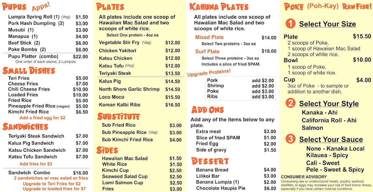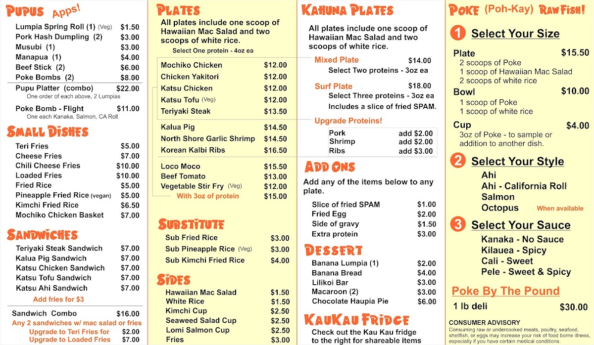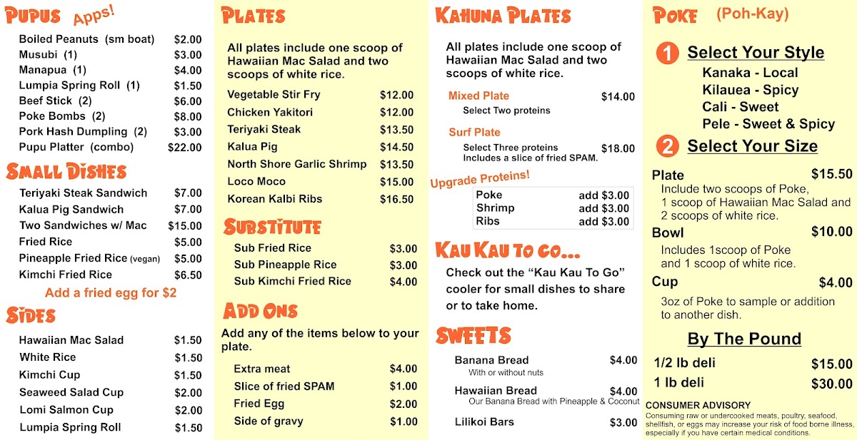 Our Salmon Poke is prepared authentic Hawaiian style. The Poke plate includes 2 scoos of raw Ahi poke, 2 scoops of white rice and 1 scoop of Hawaiian Mac salad.