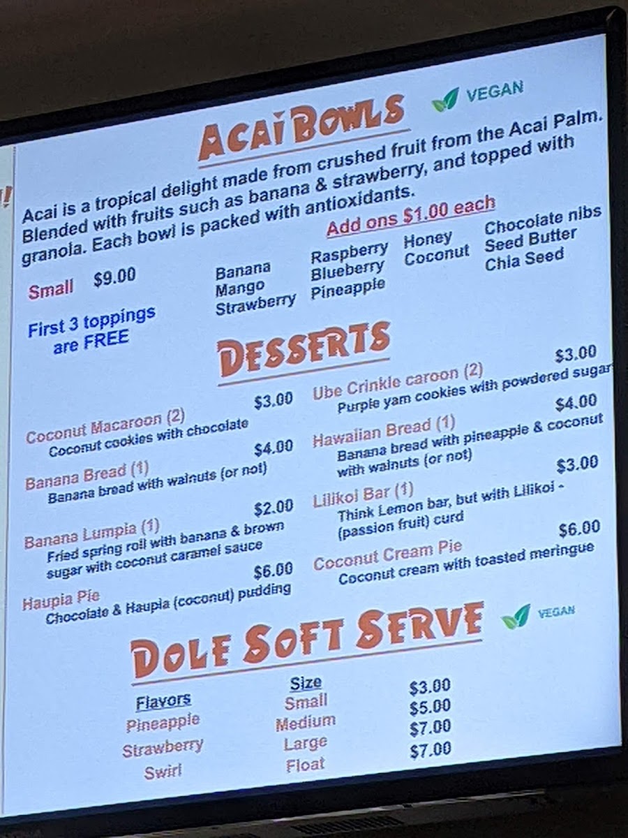 The first cowboys (Poniolos) to the islands came to the Big Island from California bringing traditional Mexican cowboy grub. Our Paniolo chili is a family recipe using island ingredients such as beef, Portuguese sausage, celery and beans. Served with two scoops of white rice. Mainly served in the Fall/Winter months.