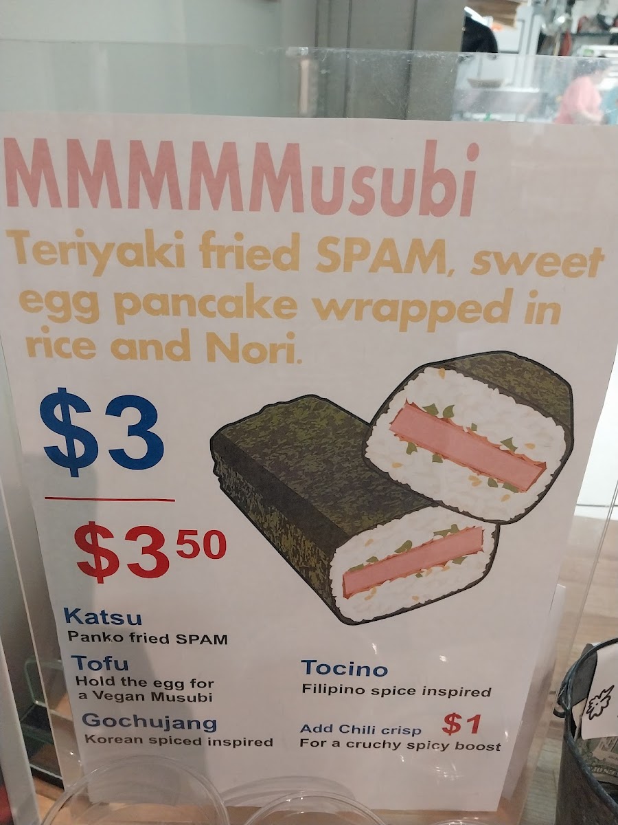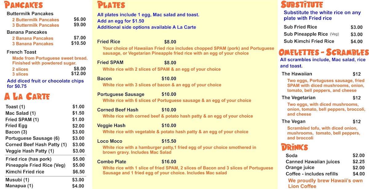 Spam Spam Spam Spam Spam Don't knock it until you try it. We lightly grill slices of SPAM and serve it with white rice and an egg. True locals put ketchup on their white rice.