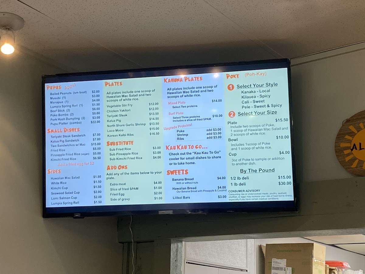 Katsu Ahi is a Panko crusted Ahi steak that's lightly fried. It's served on a toasted 3.5" Kings Hawaiian Sweet Bread bun topped with Katsu sauce, Asian Mayo and Napa Cabbage. Add fries or Mac salad for a complete meal.